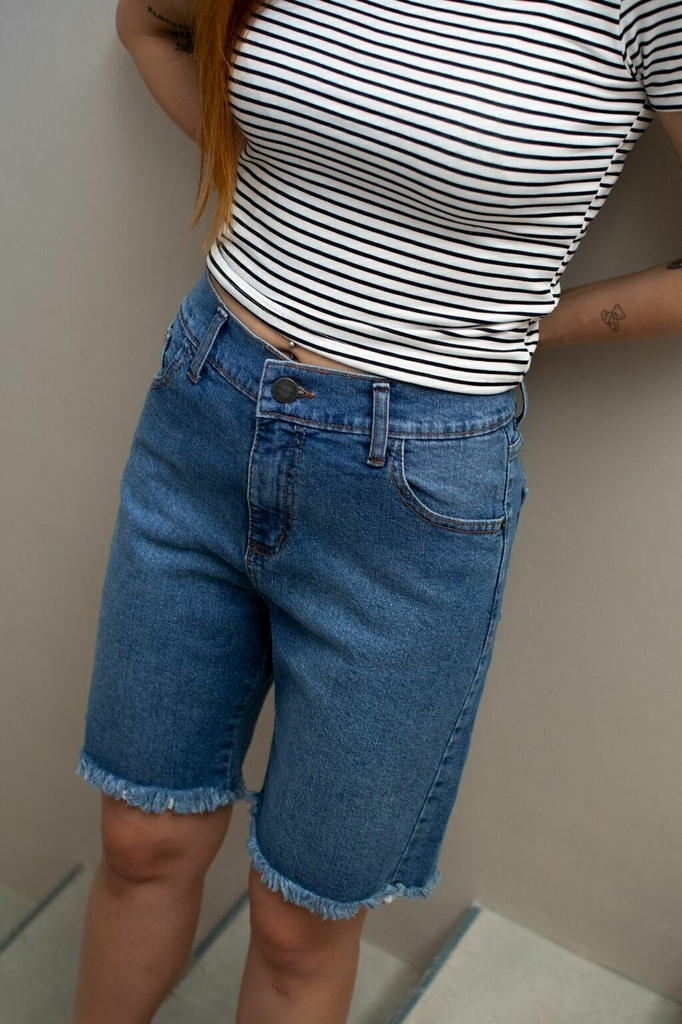 Lona de jean color azul lavado, logrando una tonalidad súper chic. Desflecada abajo.