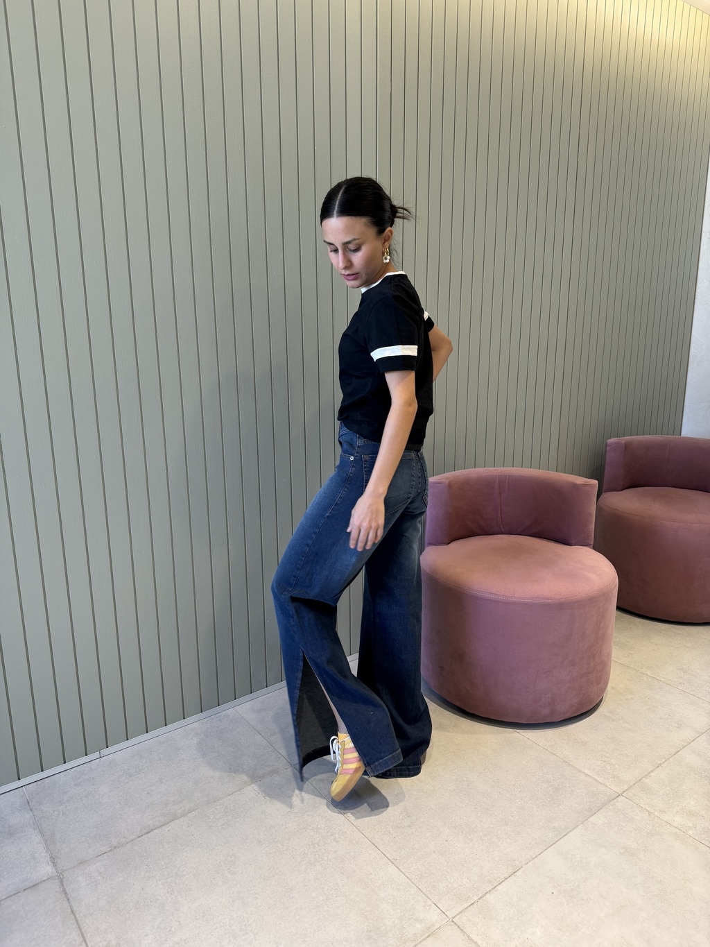 Jean tiro medio, lona semi rigida, color azul, abierto en la parte externa inferior. El jean con onda y d moda que estabas buscando!!!