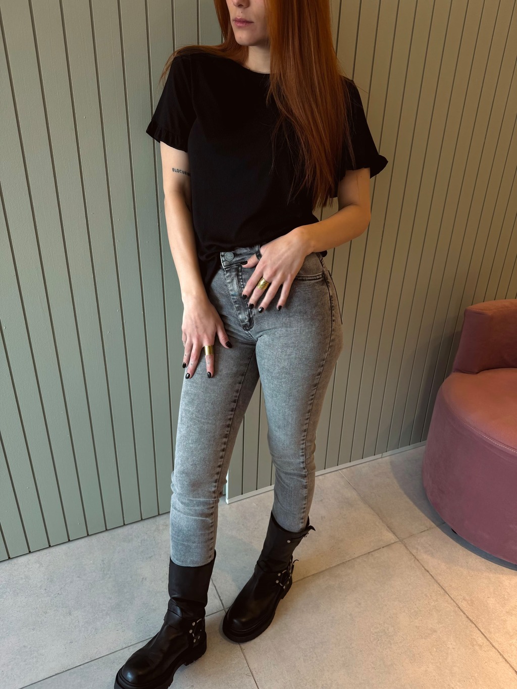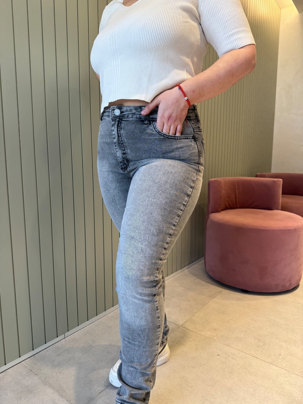 Jean corte recto color gris, lavado con fino desgaste, tiro medio, lona semi elastizada. LO MAS!!!