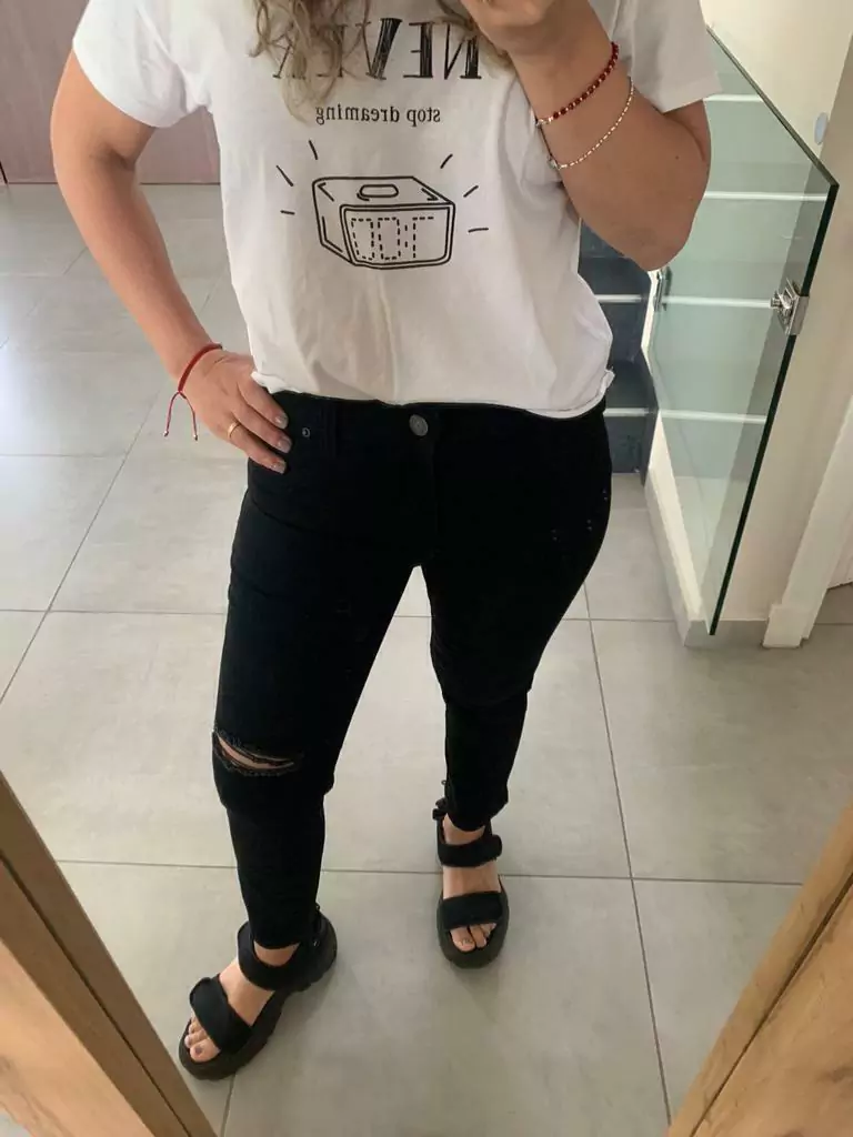 Jean corte recto, elastizado, tiro alto, con un pequeño tajo por arriba de una rodilla!